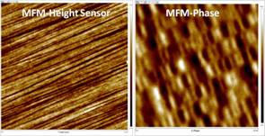 在轻敲模式操作下,测量及回馈因表面抵挡及粘滞力的作用,而引起振动探针的相位改变,因此可以采用相位差定性观察材料表面不同相区分布。