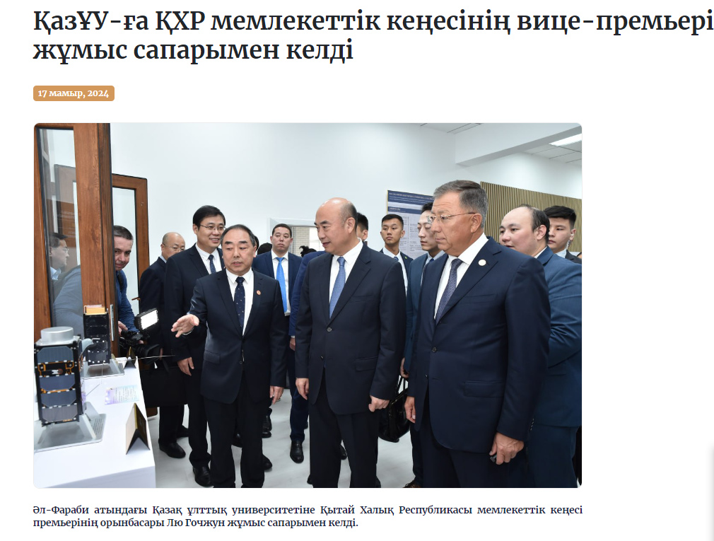2024年5月17日,中华人民共和国国务院副总理刘国中对“阿里·法拉比”哈萨克国立大学进行了工作访问。访问期间,哈萨克国立大学和必赢3003no1线路共同成立了“5G/5.5G通信技术实验室”,实验室由华为公司赞助,设于必赢3003no1线路哈萨克斯坦分校。