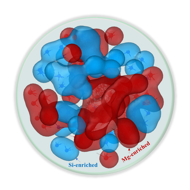 该团队采用深度学习分子动力学模拟,首次发现硅酸镁液相中存在显著的结构异质性特征,表现为富镁与富硅区域空间分布的相互排斥性。研究采用高斯密度场方法对结构异质性区域进行识别与量化,进一步揭示了结构异质性区域在空间分布上的非均匀特征及其在高压条件下的演化规律。发现,随着压力由低到高,结构异质性区域的尺度与分布趋势均呈现非单调变化:区域尺度先减小而后增大,分布先变松散而后紧实,其中拐点均出现在约8GPa。该现象与前人报道的硅酸镁液相黏度异常行为相似——黏度在5-8GPa范围内出现极小值。