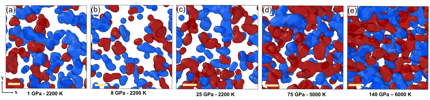 研究发现,在8GPa时,结构异质性区域典型尺寸仅为数埃;而在高达140GPa的极端压力下,大多数富集区域扩展至约1 nm,部分甚至达到数纳米,呈现更为致密的原子结构。此空间演化趋势与富集区域中氧配位结构(如Ositri和OMgtetra)比例显著上升相对应。已有研究指出,Ositri结构的增多是致密化机制的关键,本研究进一步发现OMgtetra结构亦发挥重要作用。结构异质性不仅反映了原子局域尺度上的结构特征,更为致密化行为提供了底层解释。