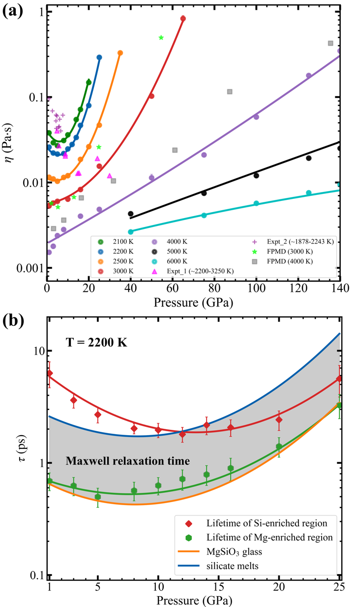 硅酸镁液相(MgSiO3liquid)是地球岩浆海洋的重要组成部分,其微观结构与动力学性质对深部地球的物质流动和物相演化具有决定性影响。深入理解该液相的结构特征,是阐释深地幔条件下硅酸镁熔体致密化机制和黏度异常行为的关键。然而,尽管已有诸多研究涉及硅酸镁液相,其原子尺度结构特征、致密化机制及与动力学性质之间的内在联系仍缺乏系统认知,黏度异常的结构起源也存在很大争议。