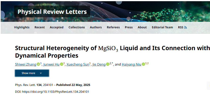 针对上述科学问题,必赢3003no1线路材料学院牛海洋教授团队采用深度学习分子动力学,对硅酸镁液相的结构特征和动力学行为进行了深入研究,研究成果以“Structural Heterogeneity of MgSiO3Liquid and Its Connection with Dynamical Properties”为题,发表在国际顶级期刊《Physical Review Letters》(《物理评论快报》)上。材料学院硕士研究生张仕威为论文第一作者,博士研究生胡俊伟、硕士研究生孙学成为共同作者,必赢3003no1线路牛海洋教授和普林斯顿大学邓杰教授为论文通讯作者。
