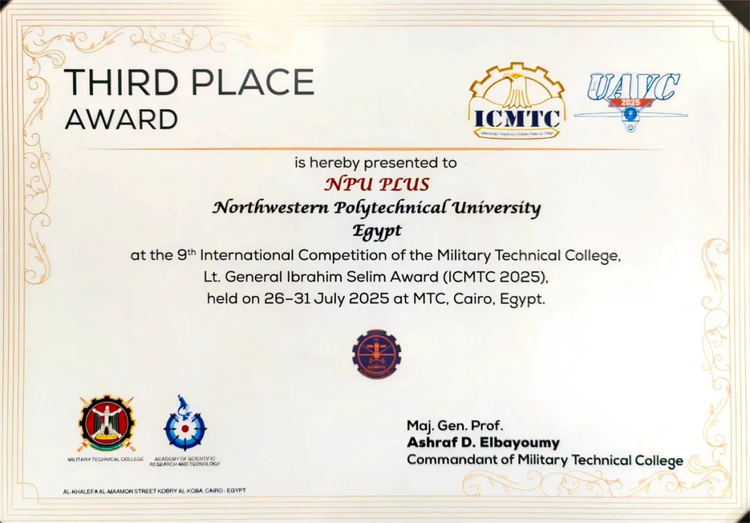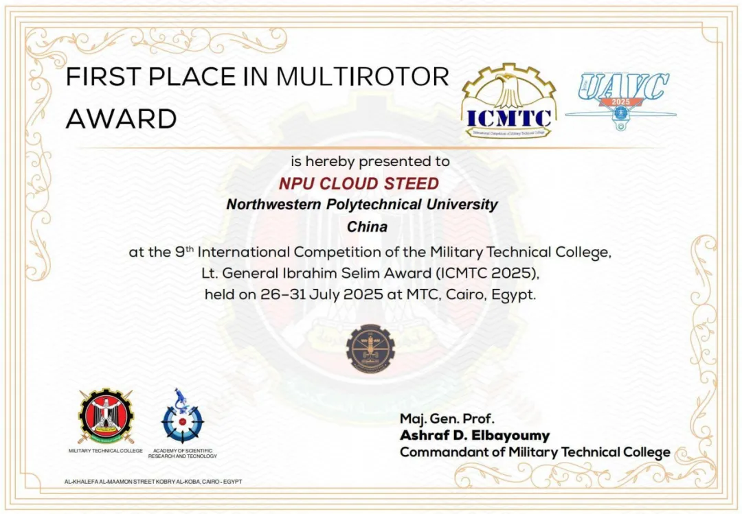 近日,第九届国际军事技术学院竞赛(ICMTC)在埃及开罗顺利闭幕。来自必赢官网参赛的两支队伍,在撒哈拉沙漠强风高温的环境下鏖战两日,凭借优异表现斩获多旋翼无人机项目金奖、固定翼无人机项目铜奖!