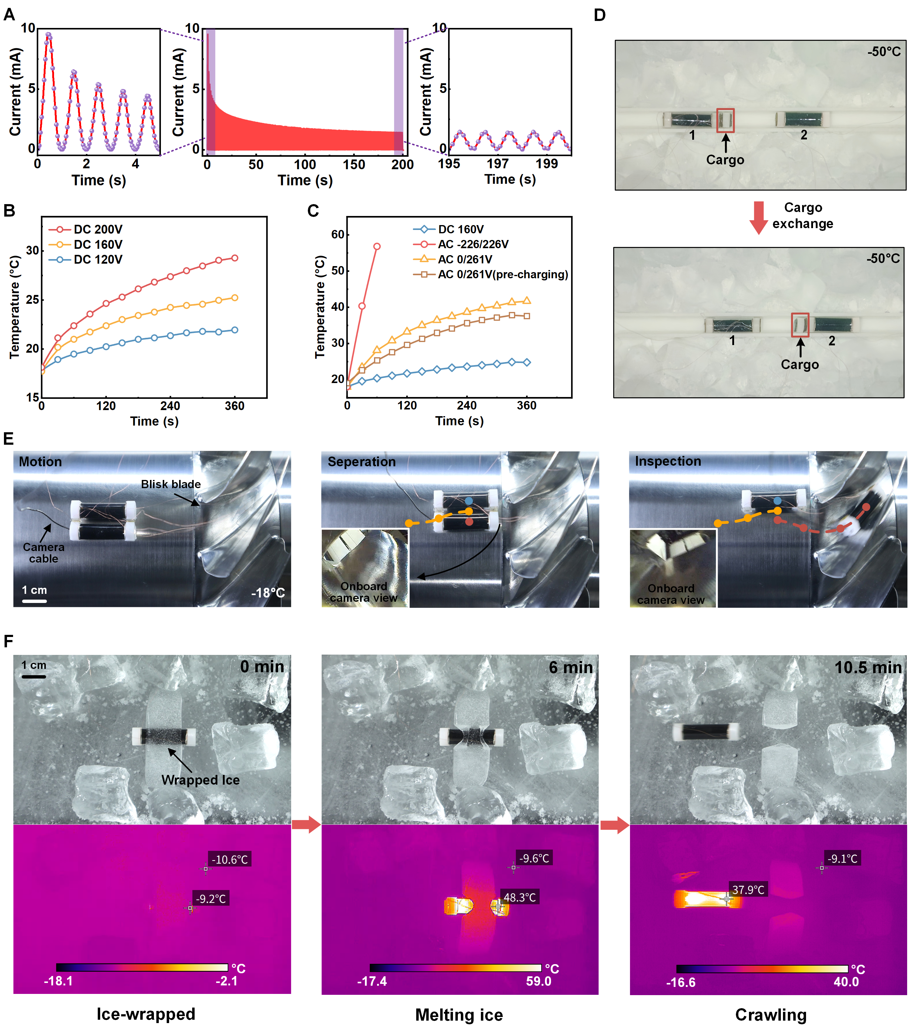 图3 机器人可控发热和冰冻环境运动。(A-C) 机器人的可控发热性能;(D-F)机器人在寒冷冰冻中执行不同的任务