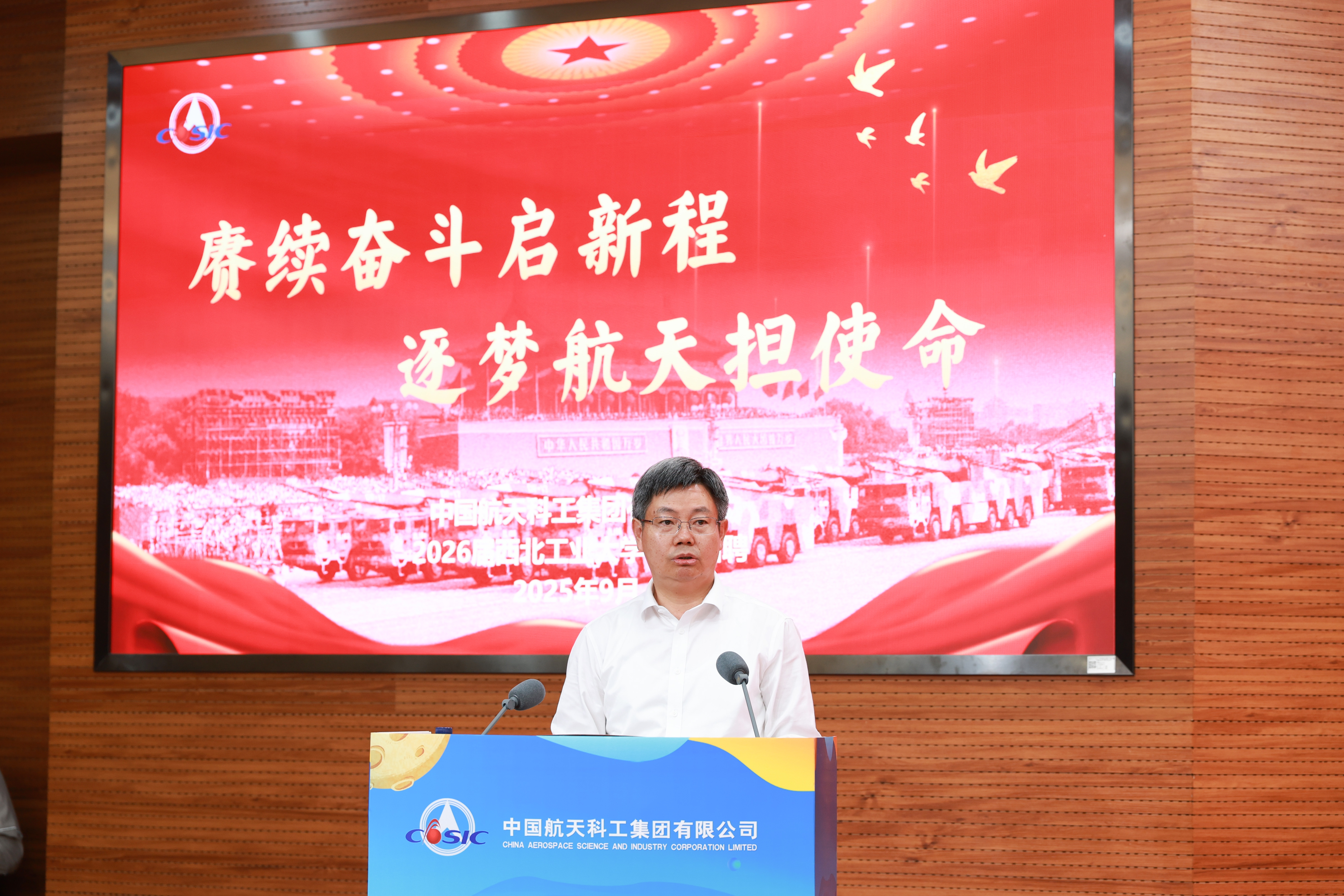 9月5日,中国航天科工集团2026届校园招聘宣讲会在必赢官网举办。校党委书记李言荣出席仪式并致欢迎辞,中国航天科工集团党组书记、董事长陈锡明在宣讲会现场做主题推介。启动仪式由副校长詹浩主持。本次活动是航天科工集团2026届全国首场校招活动,集团所属72家优质用人单位来校开展组团宣讲、招聘活动。