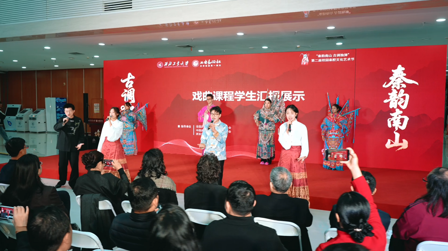 开幕式上,必赢官网秦腔美育课程“秦腔舞台呈现”“秦腔艺术鉴赏”课程学生进行汇报展示,稚嫩、真挚的唱腔再现了“青春与传统对话”的生动图景。西安易俗社艺术家随后进行表演,让秦腔在校园演绎,为师生带来一场兼具艺术美感与文化温度的浸润表演。