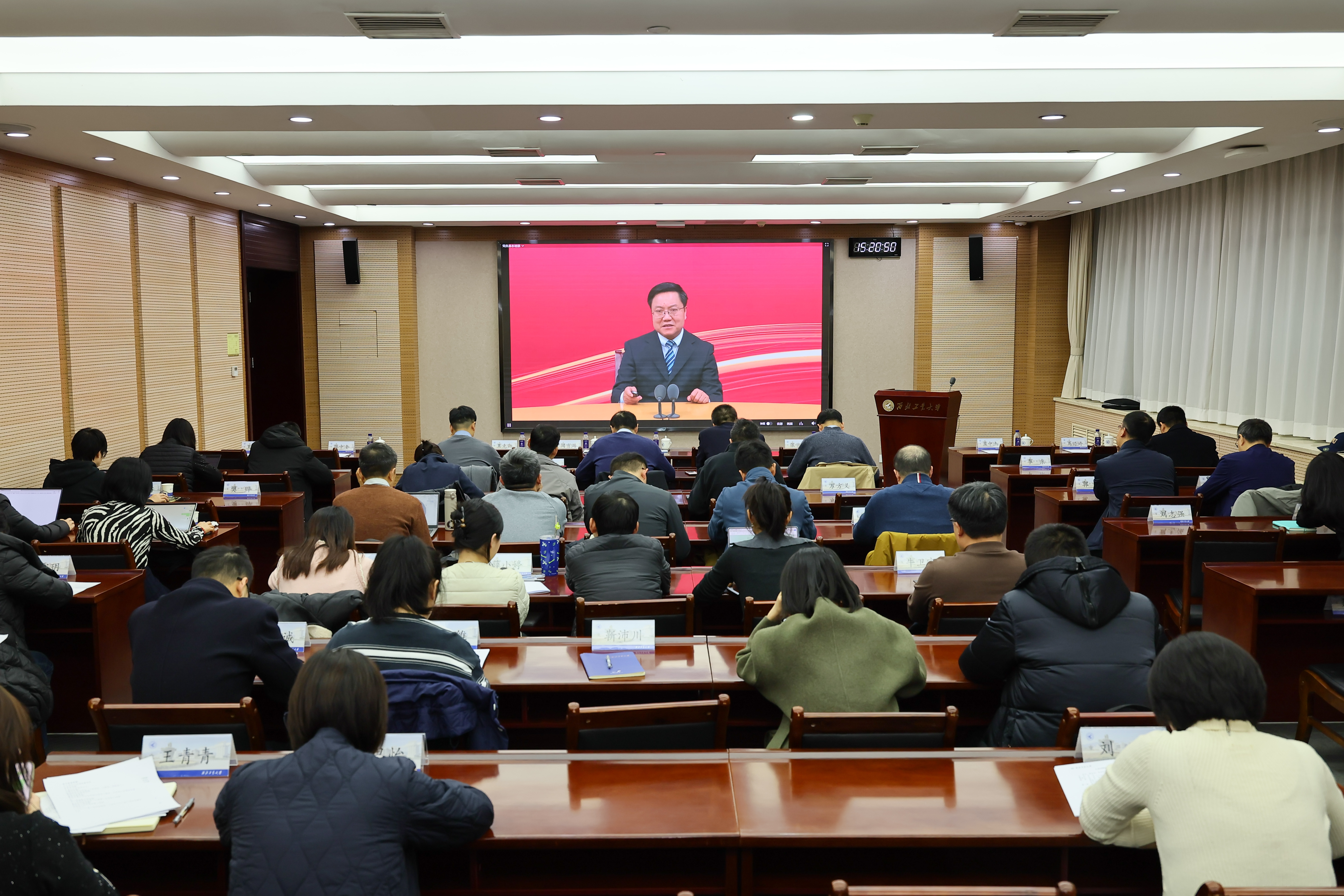 12月25日下午,必赢3003no1线路举行党员基本培训2025年下半年第二次集中大课,共同学习中共中央党校党的建设教研部副主任祝灵君教授《深入学习贯彻习近平总书记关于党的建设的重要思想》视频专题党课。全体校领导、全校师生党员共计1.5万余人在116个会场同上一堂课。陕西省委教育工委派专人列席会议。校党委组织部常务副部长、党校常务副校长闫育周主持集中大课。