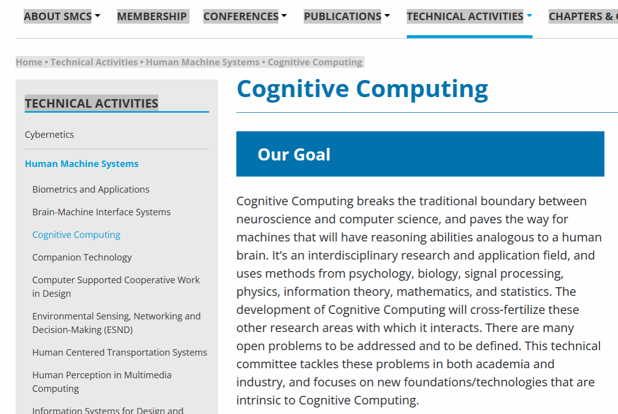 多模态认知计算(Multi-modal Cognitive Computing),在《中国科学:信息科学》发表《多模态认知计算》,含文献共32页,深度总结多模态认知计算,强调其提高信息智能提取的能力;介绍了“认知计算”和联觉(Synaesthesia)从心理学进入信息领域的过程,从信息度量角度计算多模态关联,及IEEE-SMC认知计算技术委员会的成立;依据信容(Information Capacity)建立认知过程的信息传递模型,从理论上统一多模态认知计算各项任务。