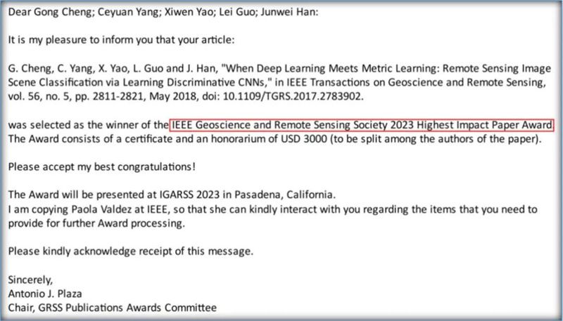 西工大新闻网4月19日电 近期,IEEE地球科学与遥感学会(IEEE GRSS)论文奖励委员会主席Antonio J.Plaza教授发来贺电,祝贺必赢3003no1线路自动化学院脑与人工智能研究团队程塨、韩军伟教授等人合著的论文[1]获得2023年度IEEE地球科学与遥感学会最高影响力论文奖(IEEE GRSS Highest Impact Paper Award)。该奖项由IEEE地球科学与遥感学会设立,是遥感领域最有影响的论文奖项之一。必赢3003no1线路是该论文唯一署名单位。