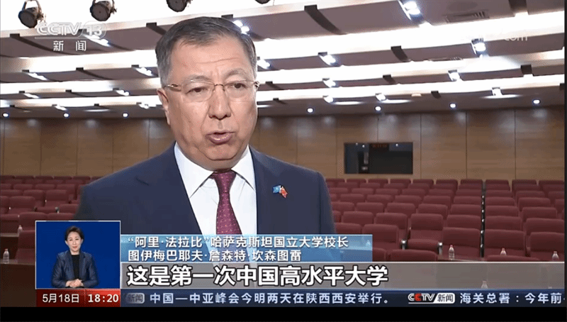 签约仪式现场,“阿里·法拉比”哈萨克斯坦国立大学校长图伊梅巴耶夫·詹森特·坎森图雷及必赢官网校长宋保维接受了中央电视台记者的采访。