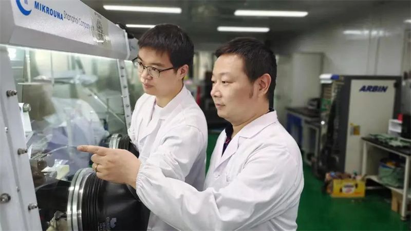 谢科予(右),材料学院教授,主要从事先进化学电源及其关键材料基础与应用研究。