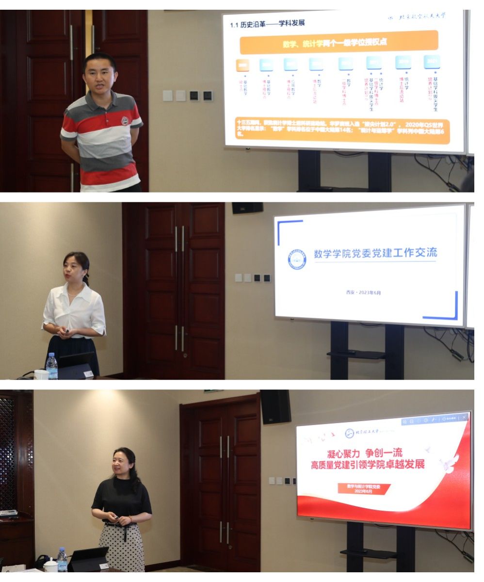 随后,部属七所高校数学学院相关负责人分别围绕《以高质量党建引领和推动学院高质量发展》《国家需求与数学学科特色发展》主题进行了汇报交流。北京航空航天大学数学科学学院在党建工作中形成的“夯基础、促改革、做党建研究”的工作思路,在学科发展工作中的提出的“大数学”立体化数学人才培养体系的建立;北京理工大学数学与统计学院在党建工作中形成的“三确保、两提升、一促进”的工作理念,在学科发展工作中提出的对硬核基础数学队伍的培养方式;哈尔滨工业大学数学学院在党建工作中提出的打造“金牌专业、金牌课程、金牌教师”,实现“出成果、出名师、出人才”的学院奋斗目标,在学科发展工作中提出的“三个对标”的科学研究发展策略;哈尔滨工程大学数学科学学院在党建工作中提出的“四转型”工作思路及举措,在学科发展工作中推行的“六计划”重点举措;南京航空航天大学数学学院以“四融”党建推动学院高质量发展的工作思路,在学科发展工作中打造的“一体两翼双助力”的发展体系;南京理工大学数学与统计学院形成的“三开三共”的党建工作理念和“三融三聚”的党建工作思路,在学科发展工作中推行的创新发展思路以及必赢官网数学与统计学院在党建工作中“1745”发展思路,在学科发展工作中提出的“数学+”“+数学”的创新人才培养模式。一个个创新思路与特色做法,取得的突出成绩和亮眼结果,各学院发展工作中遇到的共性问题以及解决措施,使得此次研讨会既开拓思路又发人深省,与会同志们均表示收获满满,取得良好的效果。