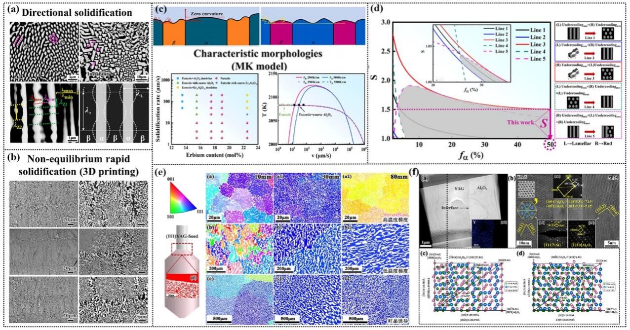 图2(a)高熔化熵氧化物共晶陶瓷定向凝固组织形态转变及规则化特征,(b)3D打印非平衡快速凝固组织特征;(c)共晶共生区预测和实验结果验证;(d)层片-棒状组织规则化转变和共存区预测,(e)籽晶诱导下共晶晶体学取向竞争演变,(f)不同相界面关系下界面错配模拟和计算