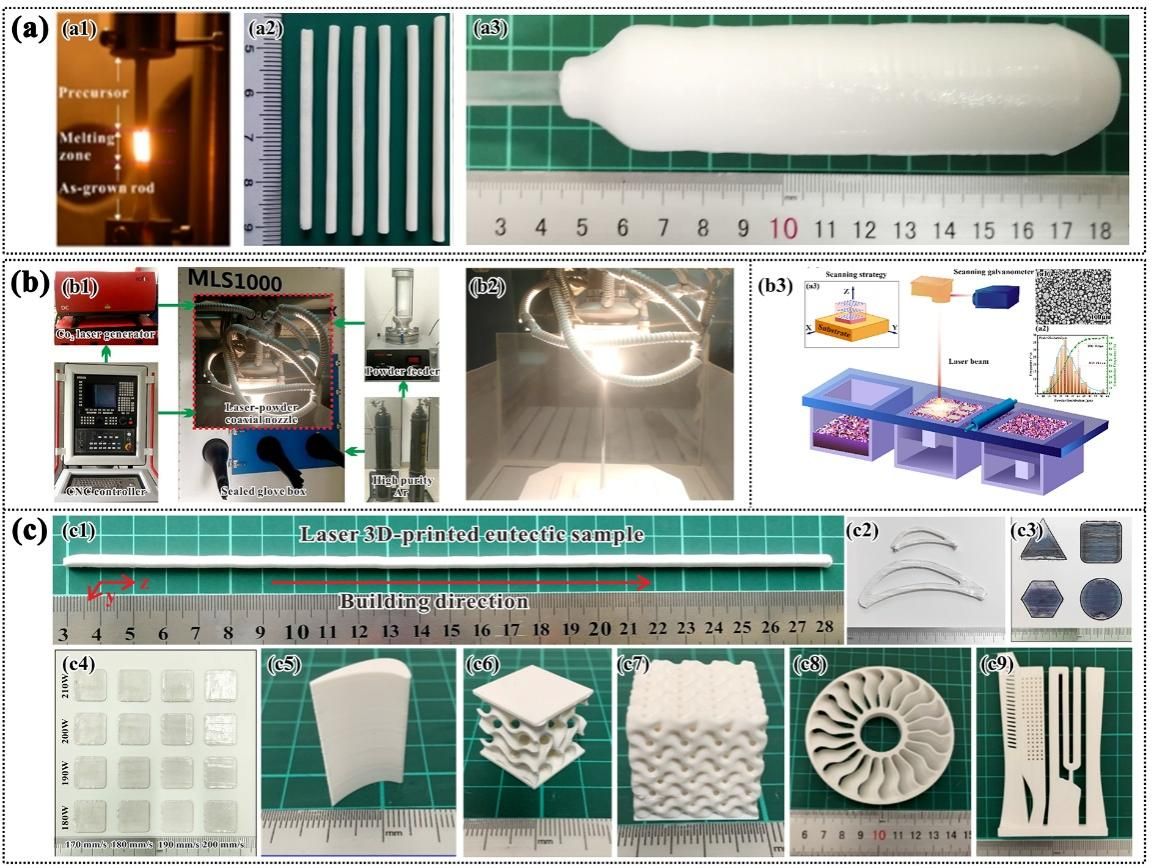 图1 (a)氧化物共晶陶瓷高梯度定向凝固方法:(a1)超高温度梯度激光悬浮技术;(a2)激光悬浮区熔共晶陶瓷试棒;(a3)定向凝固大尺寸共晶陶瓷;(b)激光3D打印成形设备:(b1-b2)激光直接定向能量沉积设备及打印过程;(b3)激光粉末床熔融设备示意图,(c)激光3D打印成形试样(c1-c4)及基于光固化3D打印的复杂构件(c5-c9)