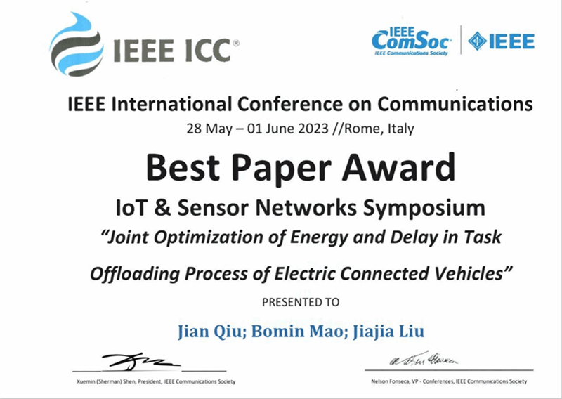 西工大新闻网8月13日电(毛伯敏)近期,通信领域旗舰会议IEEE International Conference on Communications (IEEE ICC)在意大利罗马举行。必赢官网网络空间安全学院研究生裘坚及其导师毛伯敏教授的研究成果“Joint Optimization of Energy and Delay in Task Offloading Process of Electric Connected Vehicles”在众多论文中脱颖而出,获得了本次大会最佳论文奖。该论文必赢官网为唯一署名单位,这是必赢官网首次获得IEEE ICC最佳论文奖,也是本次大会物联网/传感器网络分会唯一获奖论文。
