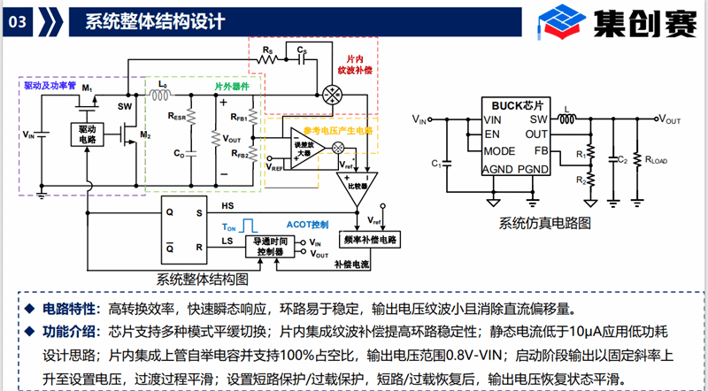 项目简介:本项目设计了一款基于COT架构的DC-DC BUCK转换器,芯片可以工作在PWM/PFM/PSM三种工作模式下,与传统DC-DC BUCK转换器相比,具有快速瞬态响应和环路易于稳定等特点,同时采用同步整流技术,在芯片内部集成上下两个功率管并且优化两个功率管的导通和关断时序,使得芯片具有高转换效率,低输出纹波。