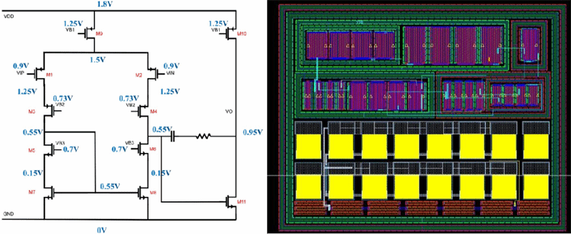 项目简介:本运算放大器采用双端输入、单端输出的二级结构。团队创新性地用等式、不等式将电路架构建模,通过建立约束表达式表征指标要求,以带宽最大化作为目标函数,将电路设计转化为优化问题;面对短沟道效应明显且仿真方法受限的问题,团队提出了“遍历栅宽”的解决办法。最终,运算放大器在其他性能指标达到要求的情况下,单位增益带宽高达410MHz。