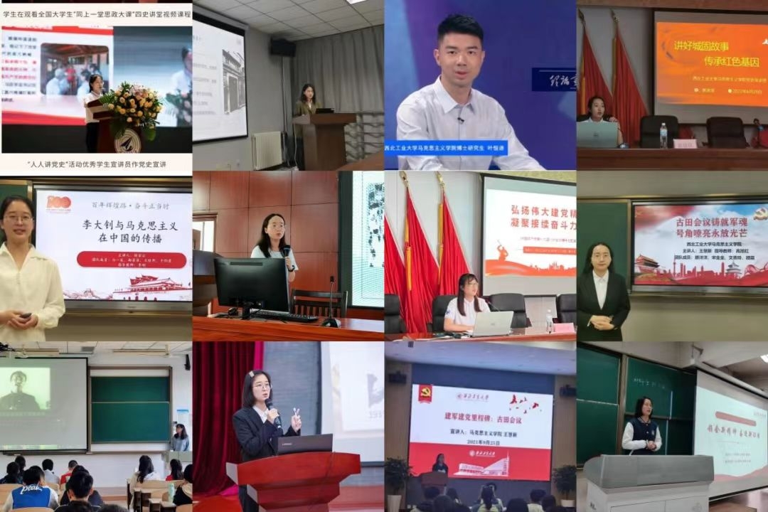 王慧新同学作为全国党建工作样板支部书记,带领马克思主义学院(原)硕士生党支部斩获20多项荣誉,个人宣讲次数达20余次,荣获学校第五届“工大青年说”演讲比赛线上赛道二等奖;侯若云同学个人宣讲次数达30余次,荣获学校“人人讲党史”活动“一等奖”、陕西省高校“讲述百年征程·献礼百岁华诞”支部“云”共建活动“优秀宣讲员”等荣誉;滕洋洋同学作为马克思主义学院中国近现代史基本问题研究系硕士生党支部书记,多次走进课堂、基层社区以及在线上进行党史宣讲,荣获学校“党史我来讲”学生微党课大赛一等奖。