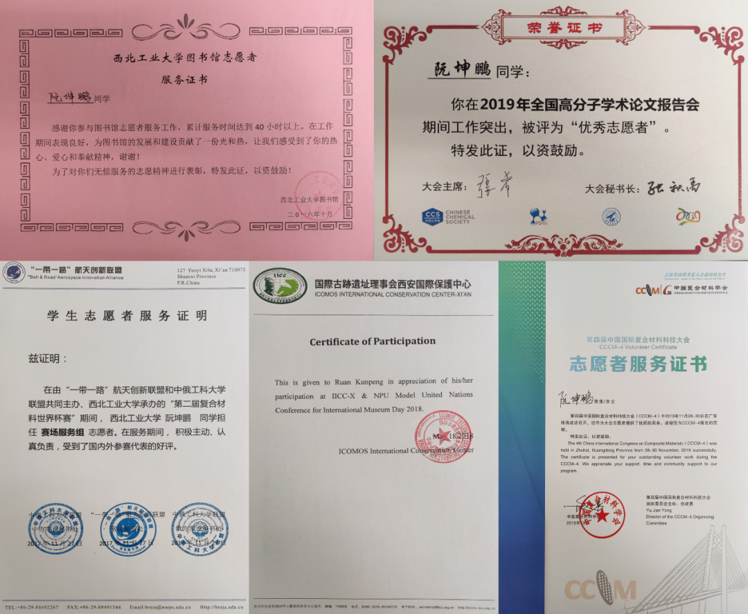 阮坤鹏不仅致力于学习与科研,还热心于参加志愿服务。他担任过第二届复合材料世界杯赛志愿者、全国高分子学术论文报告会志愿者(获评优秀志愿者)和第四届中国国际复合材料科技大会志愿者等,用自己的实际行动,让青春在奉献中闪耀出更加耀眼的光芒。