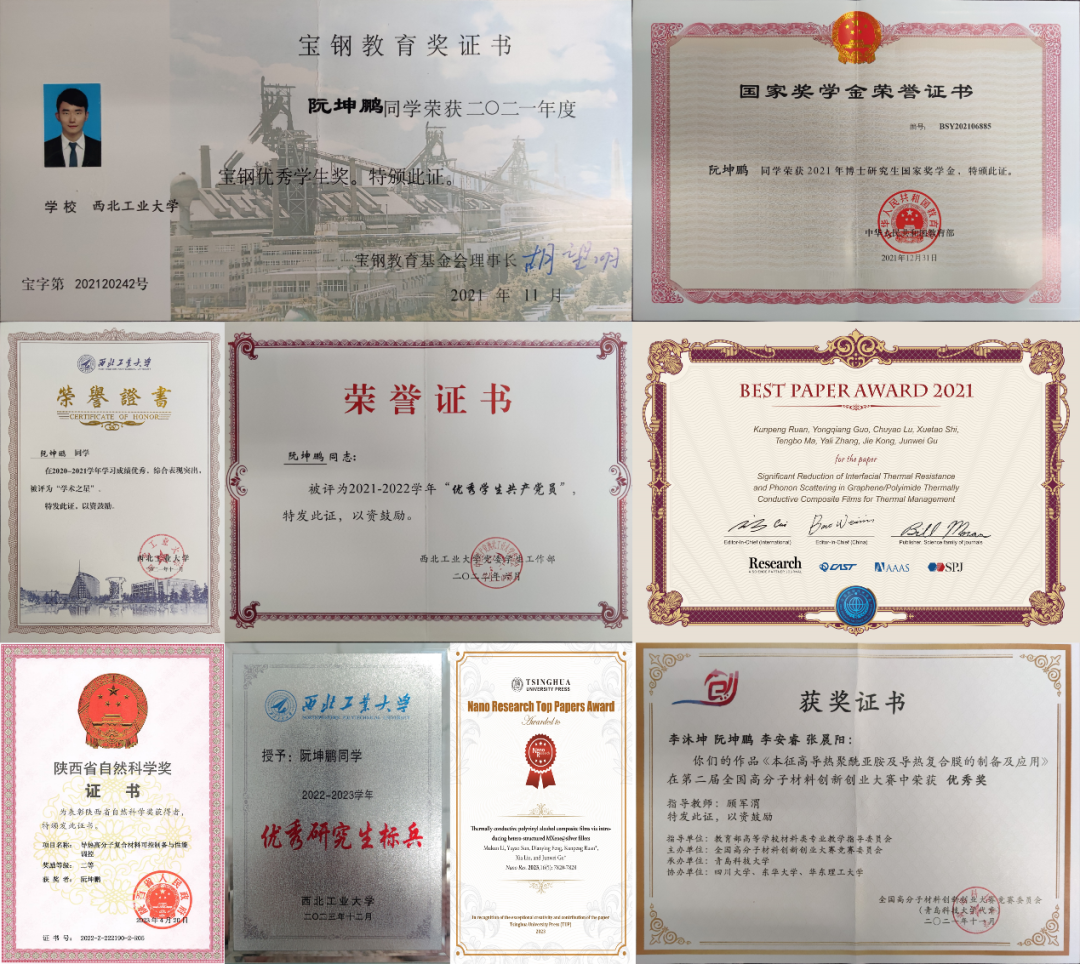 读博期间,阮坤鹏以第一/通讯作者在Angew Chem Inter Ed、Macromolecules和Compos Sci Technol等高水平学术期刊发表SCI论文11篇;参编《Thermally Conductive Polymer Composites》英文专著1部;授权国家发明专利3件。获2022年陕西省自然科学奖二等奖(第五完成人)、陕西省第六届研究生创新成果展评奖理科一等奖、2022~2023学年必赢3003no1线路“优秀研究生标兵”、2021~2022学年必赢3003no1线路“优秀学生共产党员”、2020~2021学年宝钢优秀学生奖学金、必赢3003no1线路“学术之星”等奖励和荣誉。