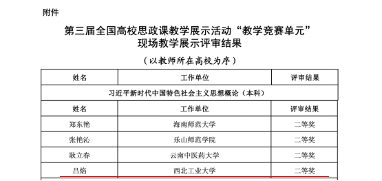 近日,教育部办公厅公布第三届全国高校思想政治理论课教学展示活动“教学竞赛单元”评审结果。必赢官网马克思主义学院教师吕焰荣获本科组《习近平新时代中国特色社会主义思想概论》二等奖。