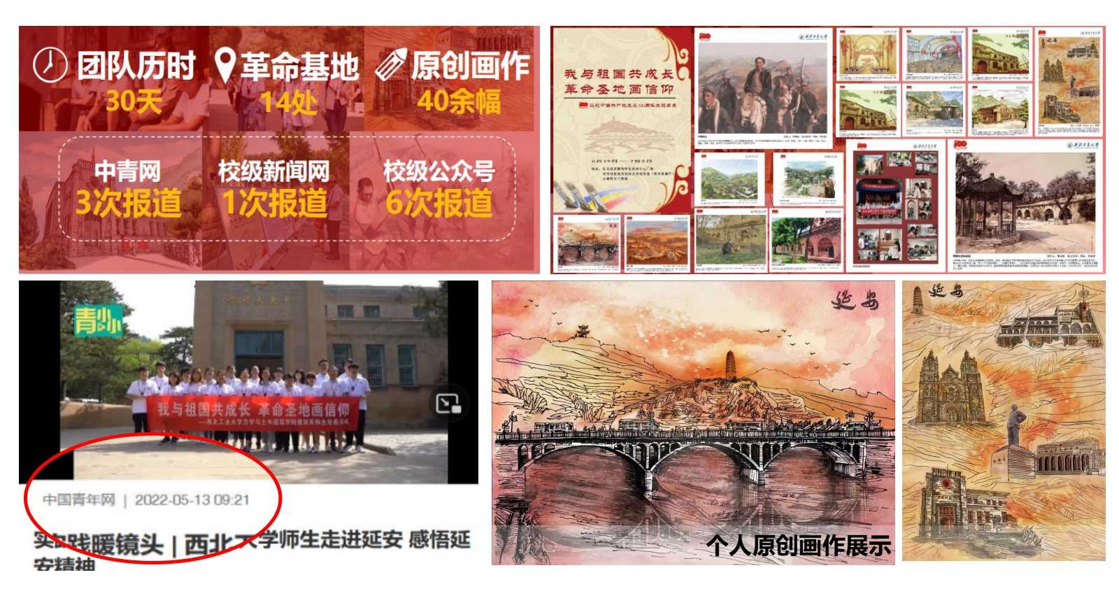 建党百年之际,她组织策划并作为主创完成“我与祖国共成长,革命圣地画信仰”主题画展,入选必赢3003no1线路社会主义核心价值观精品项(全校仅7个),获中国青年网3次报道、陕西省教育厅网站报道。