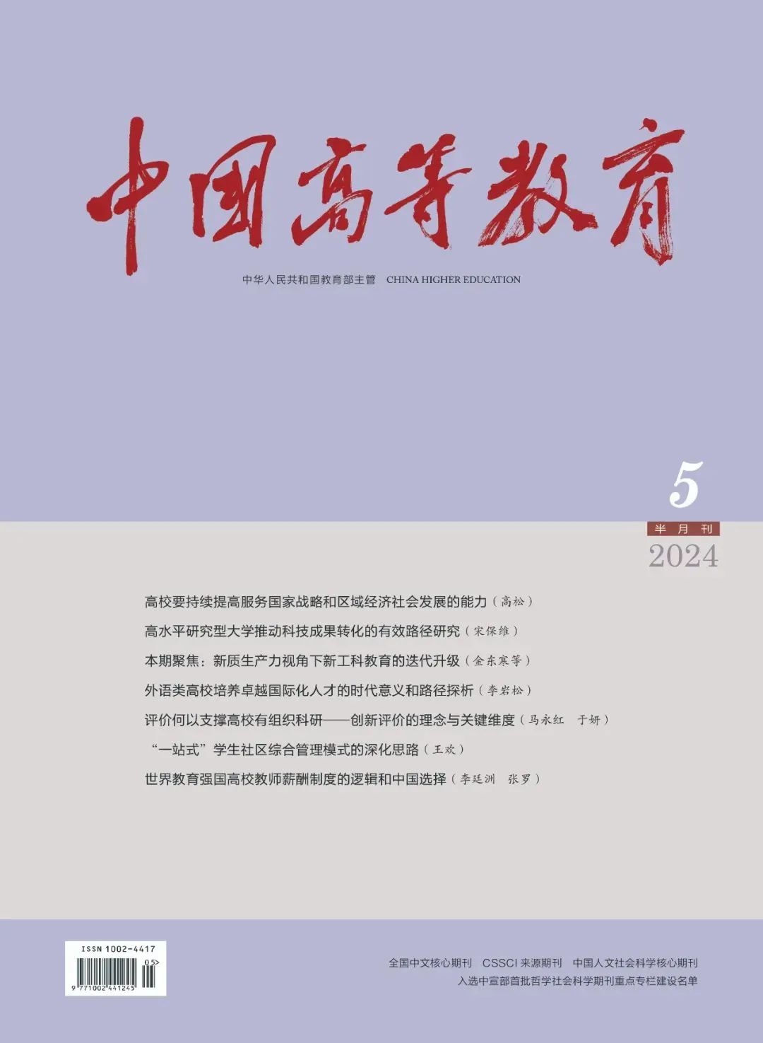 扩展阅读:《中国高等教育》(半月刊)创刊于1965年,是教育部所属的全国惟一的高等教育指导性、综合性期刊。刊物始终坚持正确舆论导向,与时俱进,在及时准确地宣传中央和教育部有关方针政策及工作部署的同时,力求深度报道各地、各高校改革和发展的新思路、新举措,反映广大师生关注的热点、难点问题。刊物现已成为全口径了解各个时期高教工作方针政策、理性探索及新思维、新经验的重要窗口。