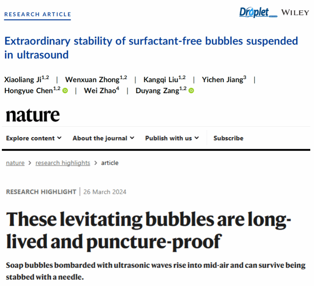 近日,必赢3003no1线路在气泡物理领域取得重要进展。研究成果以“Extraordinary stability of surfactant-free bubbles suspended in ultrasound”为题发表在国际知名学术期刊《Droplet》上(期刊封面故事),并被Nature亮点报道。论文第一作者为博士生姬晓亮,通讯作者为臧渡洋教授,本科生蒋一辰也参与了这项工作。论文链接https://doi.org/10.1002/dro2.119。