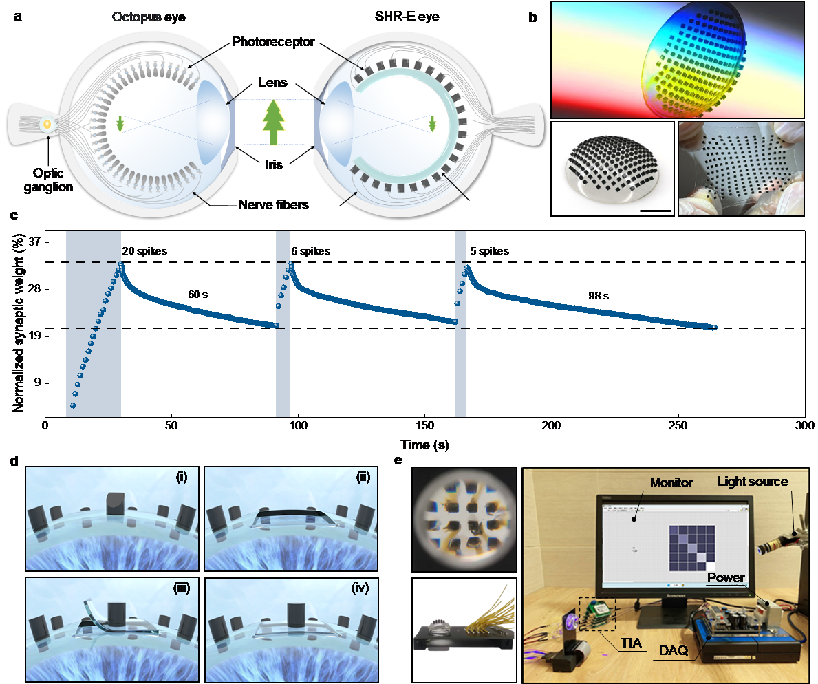 近日,在必赢官网柔性电子基础学科研究中心的支持下,必赢3003no1线路柔性电子基础科学中心黄维院士与南京工业大学刘举庆教授、刘正东副教授合作报道了一种基于离子凝胶异质结光感受器的生物眼启发型自驱动视网膜形态眼(SHR-E)。它具有宽光谱感知(365至970 nm)、宽视场(180°)和光突触(双脉冲异化指数为153%)行为,能够实现生物视觉系统的光学成像和运动跟踪功能。重要的是,该仿生眼以离子为信号传输的媒介,与生物体中信号传递的方式相似,从而实现了无需要外部能量输入的宽视场探测和高效的视觉信号处理。值得指出的是,由于离子凝胶本征具有的自愈合性,该仿生视网膜具备了移植修复能力,通过替换功能失调的光感受器,实现视网膜的移植修复,进而恢复视觉功能。此外,其出色共形能力使其能够轻松贴合任意几何形状,为未来在复杂多场景中的应用提供了无限可能。该研究工作不仅为人工视觉系统的发展提供了新的方向,也为生物电子学和类脑视觉领域的深入探索奠定了基础。相关研究工作以“A bionic self-driven retinomorphic eye with ionogel photosynaptic retina”为题发表在国际著名期刊Nature Communications(《自然•通讯》)上。