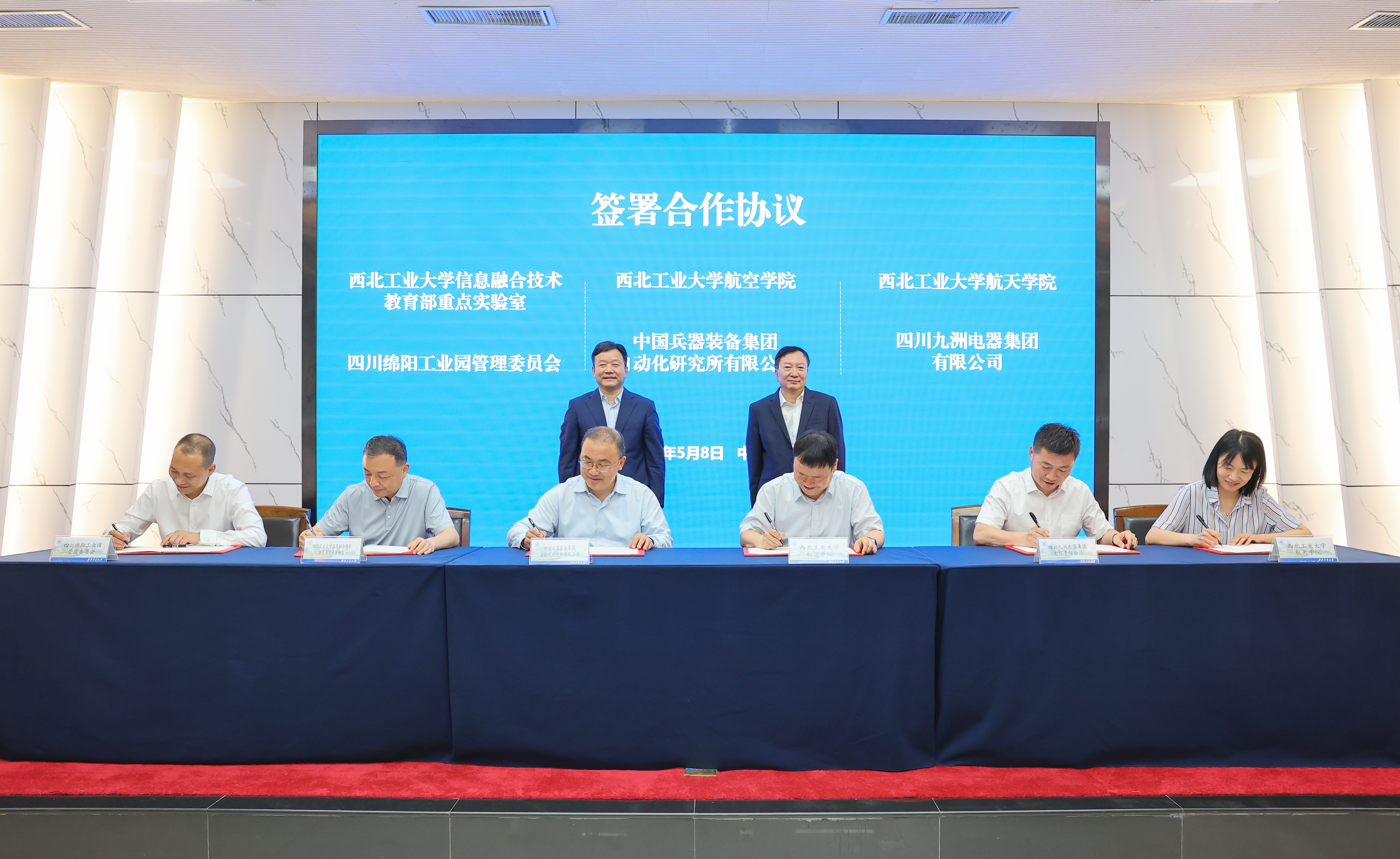 在李言荣与曹立军的共同见证下,学校与中物院应用电子学研究所、中国航发四川燃气涡轮研究院、四川九洲投资控股集团有限公司签署合作协议,校内航空学院、航天学院、信息融合技术教育部重点实验室分别与中国兵器装备集团自动化研究所有限公司、四川九洲电器集团有限公司、四川绵阳工业园管理委员会签署合作协议。