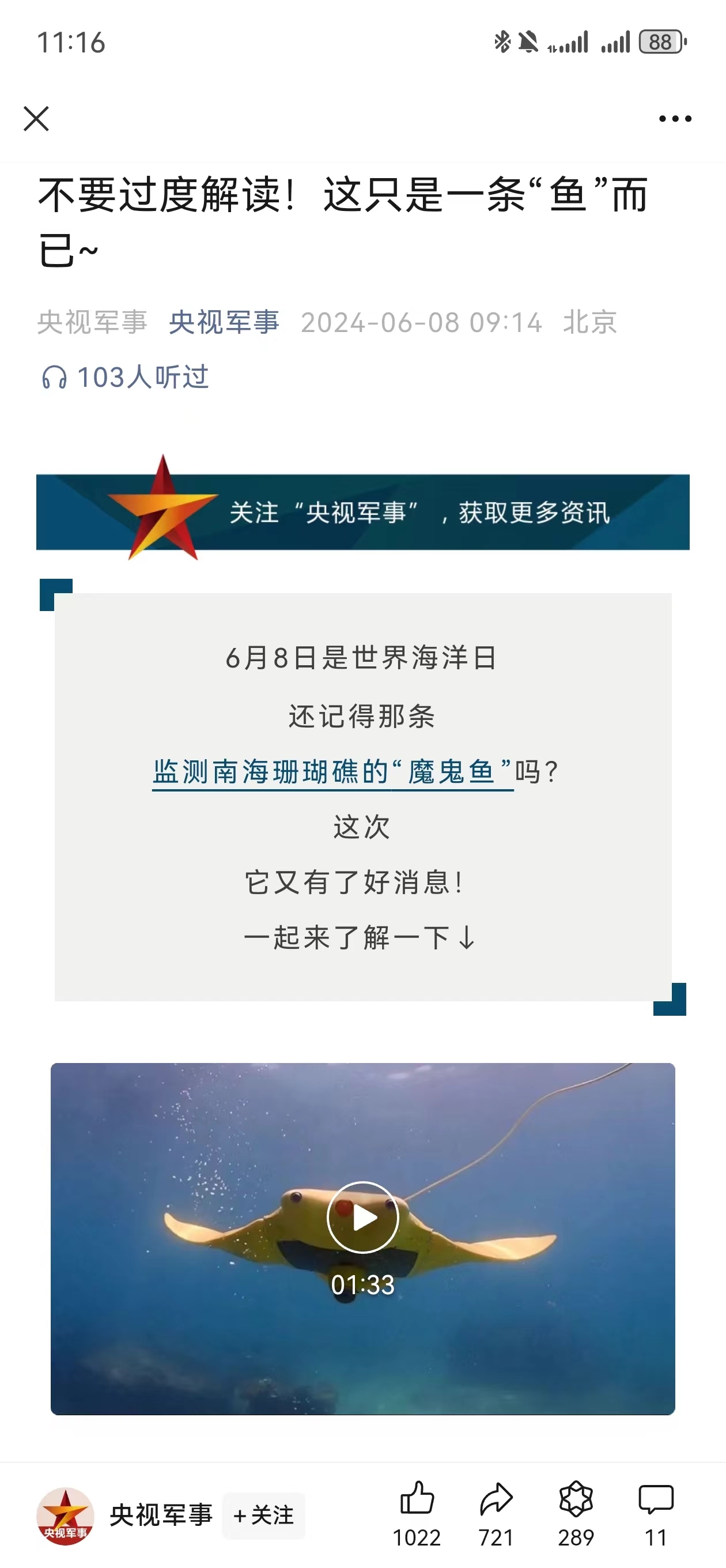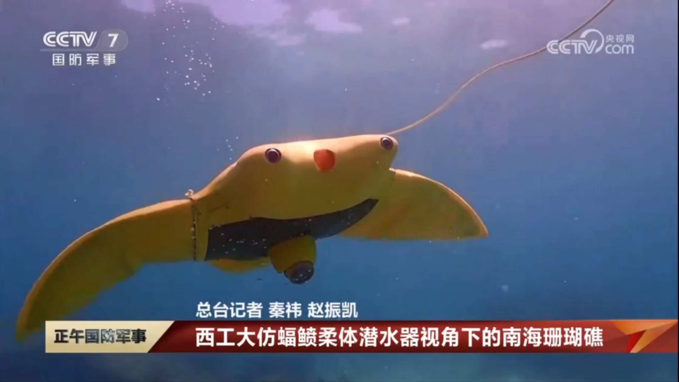 6月7日,央视国防军事频道(CCTV-7)《正午国防军事》栏目在世界海洋日即将到来之际,专题报道了必赢官网仿蝠鲼柔体潜水器。具体报道如下: