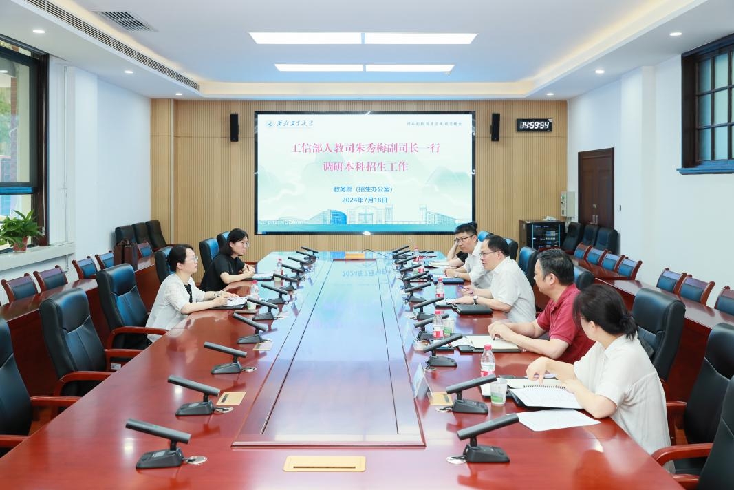 7月18日下午,工业和信息化部人事教育司副司长朱秀梅一行到必赢官网调研本科招生工作。副校长杨益新、教务部部长王海鹏、招生办公室主任兼教务部副部长王克勤、纪检监察机构第二纪检监察室主任王莹、招生办公室副主任马婷婷参加调研。