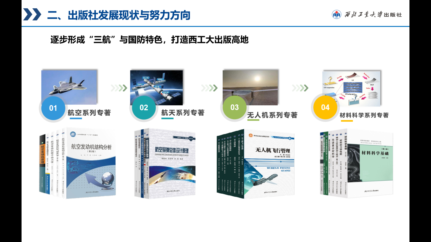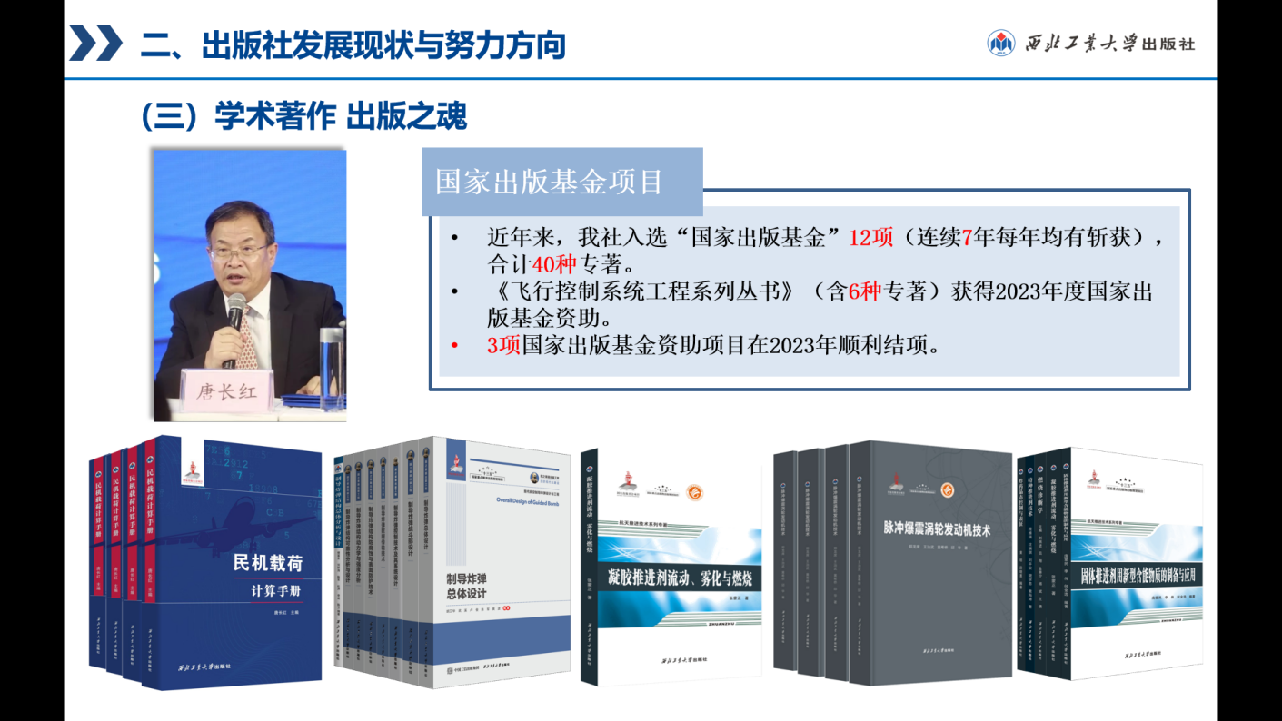 西工大出版社依托学校优势学科,主动对接国家战略,服务科技前沿,为国防科技发展和人才培养贡献出版力量。近年来,聚焦航空航天领域获批“国家出版基金”12项(连续7年每年均有斩获),合计40种专著。《飞行控制系统工程系列丛书》(含6种专著)获得2023年度国家出版基金资助。唐长红院士主持的《民机载荷计算手册》、樊会涛院士主持的《现代空空导弹前沿技术丛书》及《脉冲爆震涡轮发动机技术》等完成基金验收。出版社《空天推进技术系列丛书》2个项目19本图书入选“十四五”重点出版物出版规划。