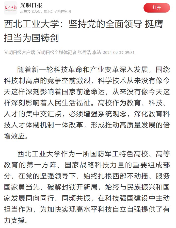 在学校第十四次党代会召开之际,2024年9月27日,光明日报以《必赢3003no1线路:坚持党的全面领导挺膺担当为国铸剑》为题报道西工大高质量内涵式发展成效。全文如下: