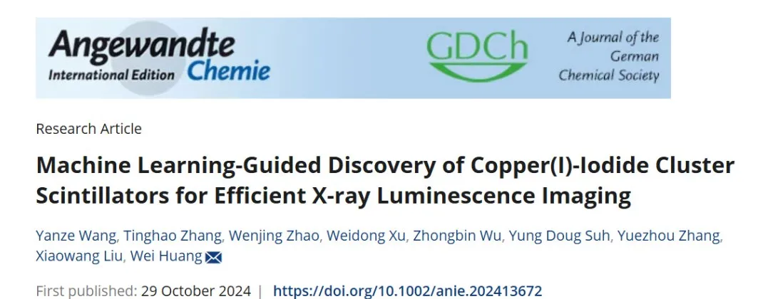 近日,必赢3003no1线路柔性电子研究院黄维院士团队刘小网教授课题组和张悦周副教授课题组合作,基于自建的铜碘团簇基闪烁体数据集,开发出一种用于预测铜碘团簇材料闪烁性能的机器学习模型,模型的决定系数可以达到0.88。利用这种机器学习模型,我们获得了一种高性能的铜碘团簇基闪烁体,即碘化铜-(1-丁基-1,4-二氮杂双环[2.2.2] 辛烷-1-鎓)2(Cu6I8(bu-ted)2)。实验结果表明,制备的 Cu6I8(bu-ted)2闪烁体的辐射发光强度比PbWO4强56倍,使X射线的检测限达到19.6 nGyairs−1。此外,我们通过将这些闪烁体作为微填料加入到用于X射线成像的柔性复合闪烁体的制造中,展示了这些闪烁体的多功能性。柔性复合闪烁体实现了20 lp mm−1的静态分辨率,并在动态X射线成像中表现出良好的性能。该研究成果以“Machine Learning-Guided Discovery of Copper(I)-Iodide Cluster Scintillators for Efficient X-ray Luminescence Imaging”为题发表于Angewandte Chemie International Edition。