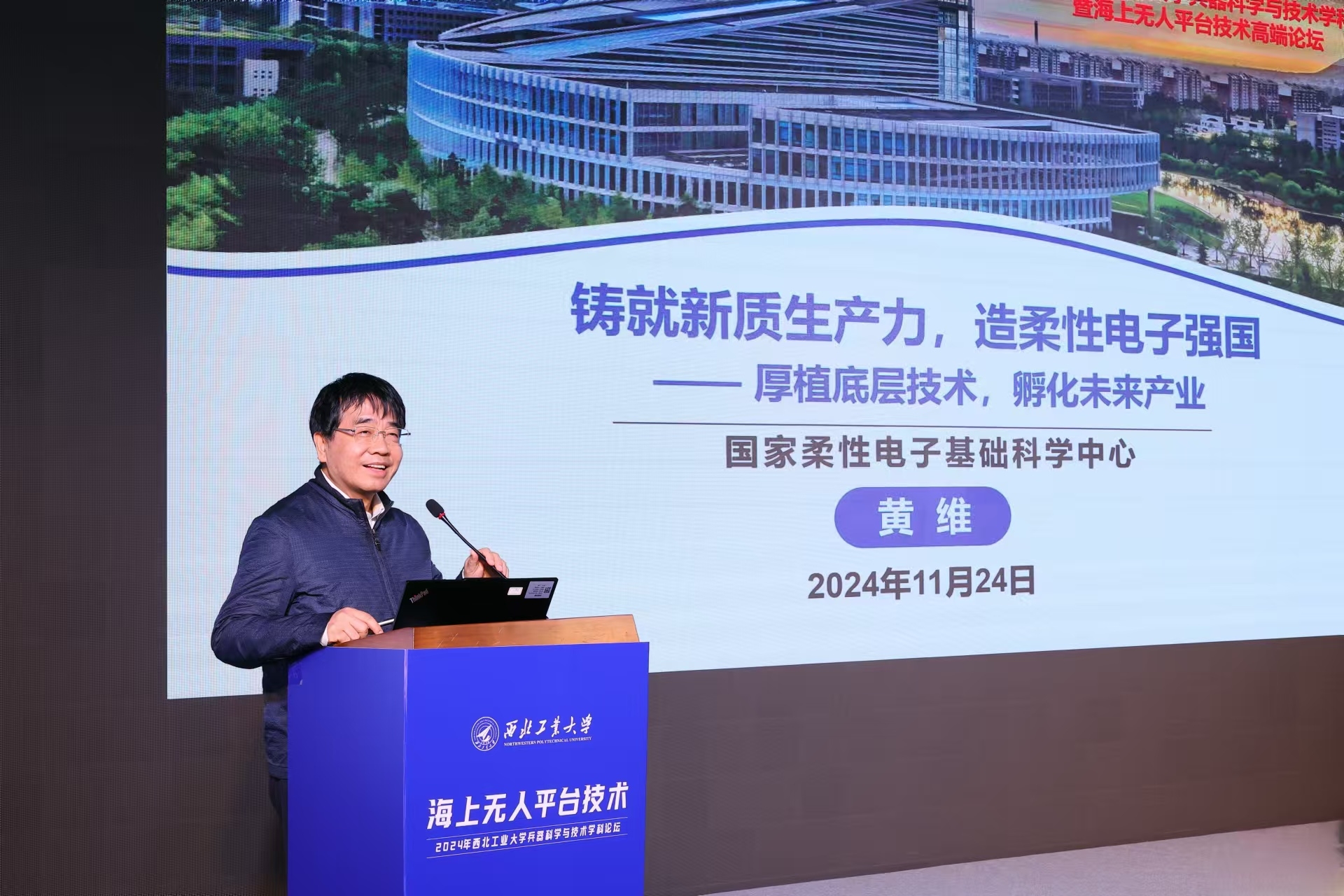 黄维院士以《铸新质生产力,造柔性电子强国》为题作报告,他从国家战略需求、柔性电子引领高质量发展、创新团队与研发成果等方面分享了柔性电子未来前景及发展趋势。提出只有夯实前瞻性基础研究,加快发展底层技术,突破现有技术框架,才能开辟新赛道、开拓新领域、制定新标准,实现“开道超车”的历史性变革。