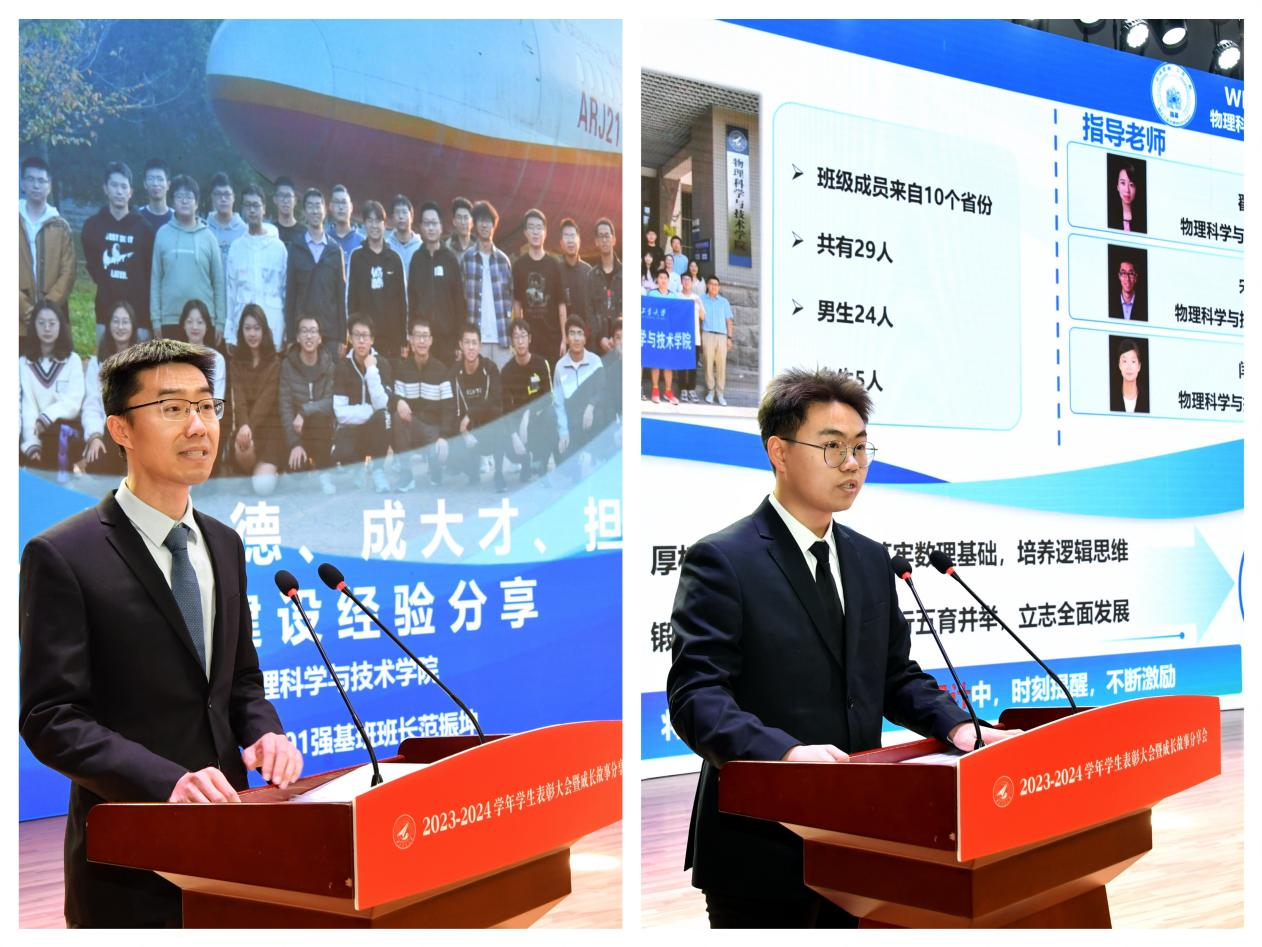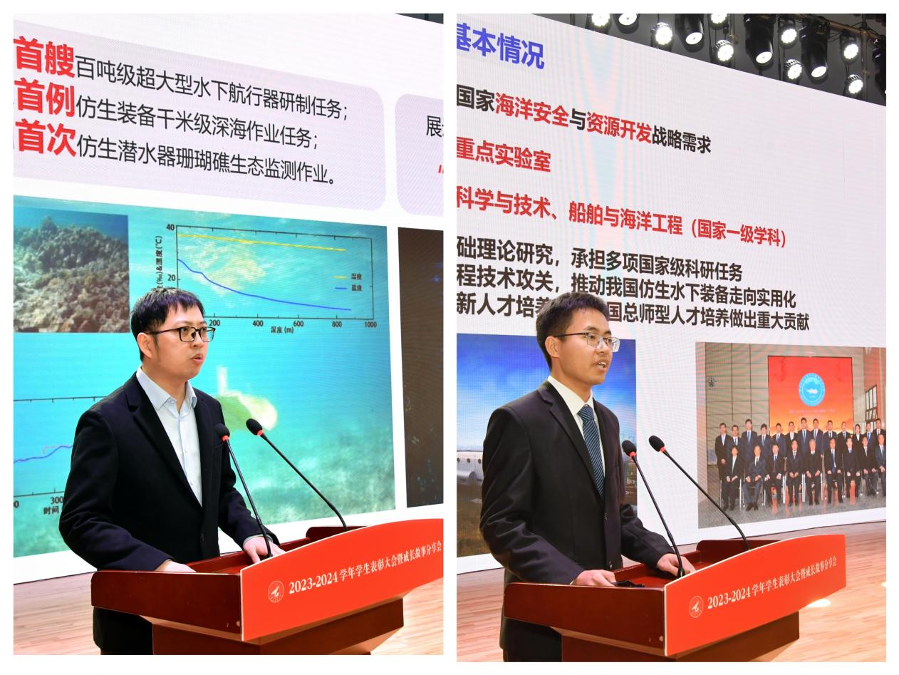 模范班级代表、必赢3003no1线路2021级强基班班主任宋坤、班长范振坤携手上台,从“坚定理想信念,厚植报国情怀”“筑牢数理基础”“提升科学素养,锻炼科研能力”“践行五育并举,立志全面发展”四个方面分享了大家互信互助,走进大团队、走上大舞台,“如同物理学中的合力与分力,相互依存、不可分割”的成长故事。模范研究生导学团队代表、航海学院“智能仿生潜水器”科技创新团队指导老师叶鹏程与硕士研究生李鑫,共同讲述了团队秉持“向海图强,向海而兴”理念,面向国家海洋安全和资源开发战略需求,依托自主水下航行器团队将立德树人与科研实践相结合的青春宣言。
