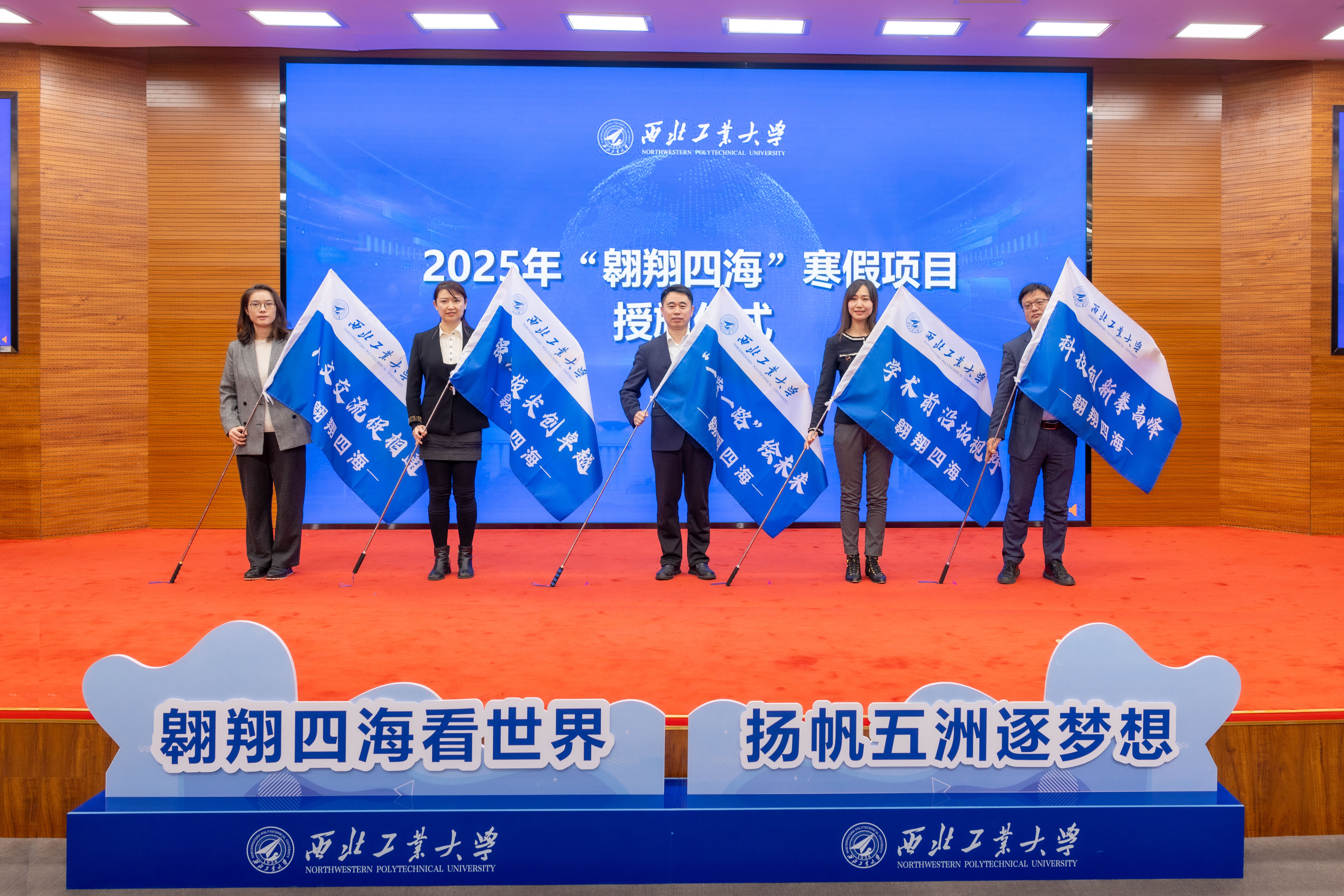 李言荣为获得2024年“翱翔四海”项目一等奖的8支队伍获奖代表颁奖,并为2025年寒假项目5个主题代表授旗。