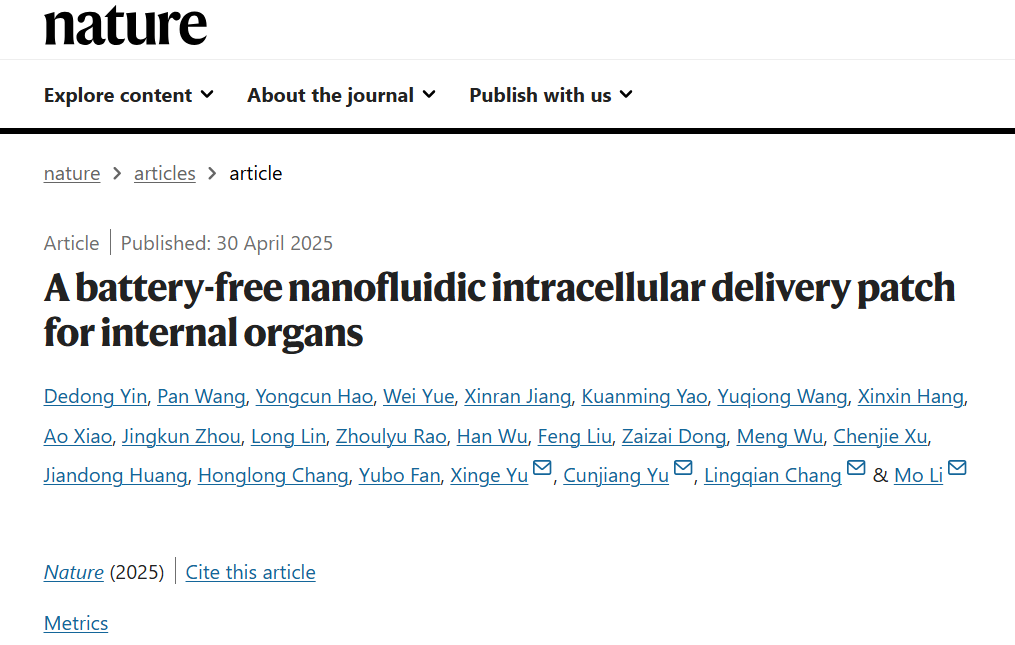 2025年4月30日(北京时间),国际著名学术期刊《自然》(Nature)杂志在其官方网站上刊登了题为“A battery-free nanofluidic intracellular delivery patch for internal organs”的学术论文。该论文由北京航空航天大学、北京大学第三医院、必赢3003no1线路等12家单位携手完成。必赢官网机电学院郝永存副研究员为论文共同第一作者。