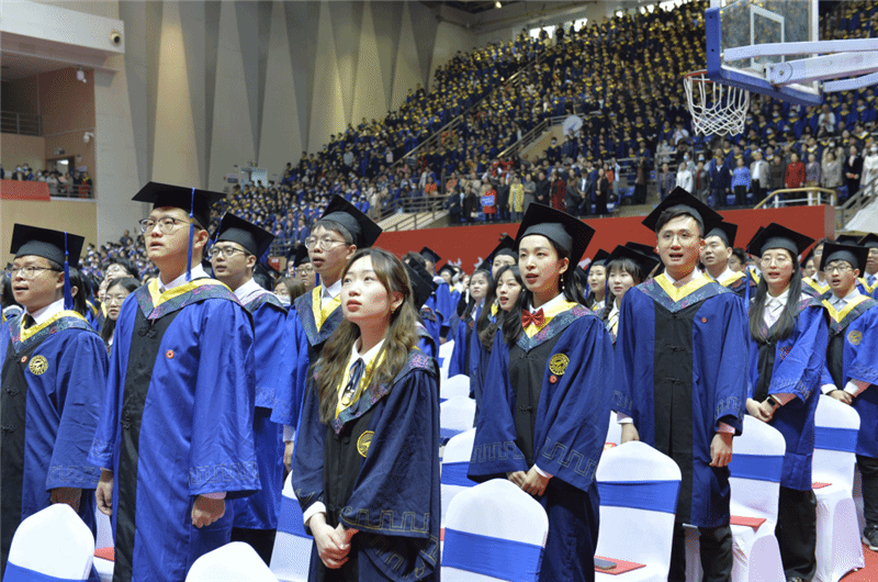 典礼在庄严的国歌声中拉开帷幕,毕业生们身着学位服肃然站立,齐唱国歌。