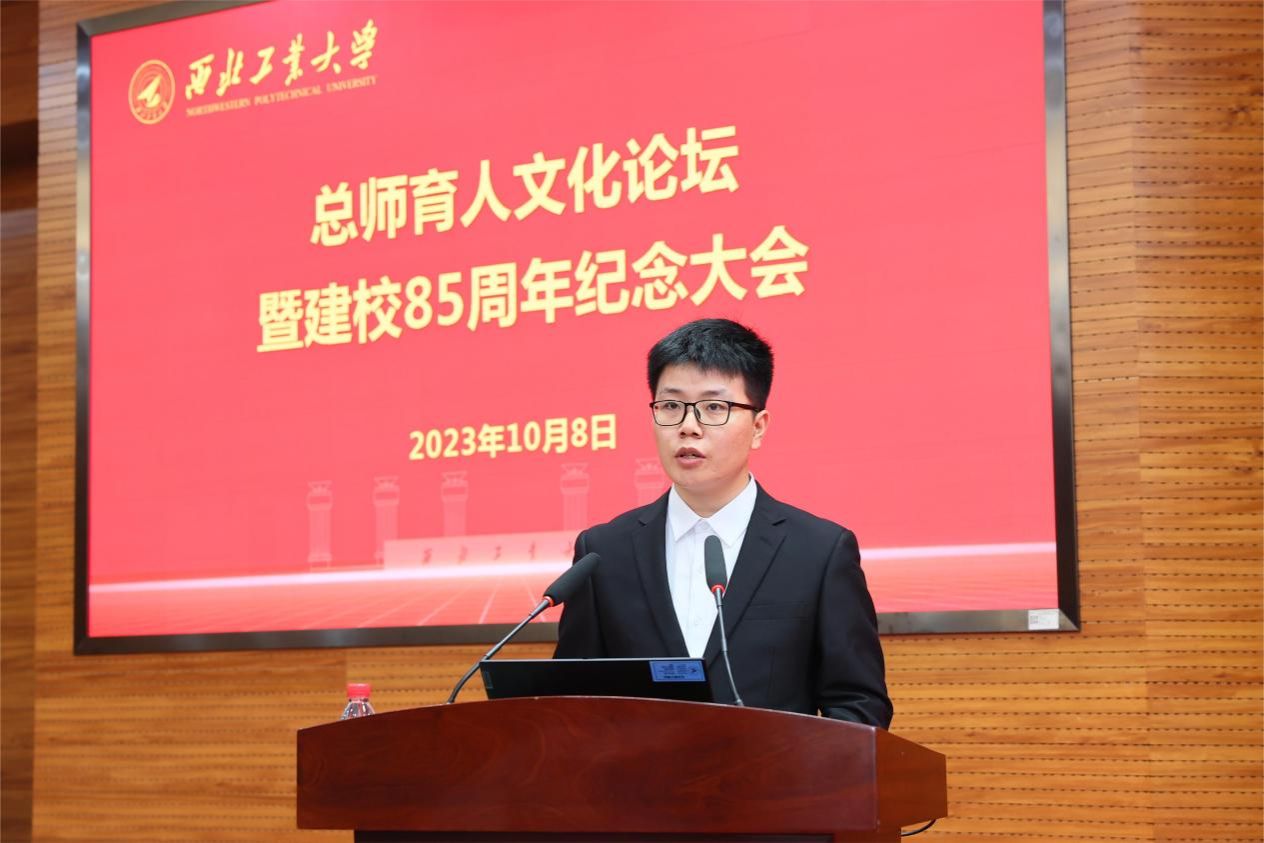 学生代表、航天学院参研“飞天一号”博士生高屹在发言中说,在学校80周年校庆时,三位总师的同台朗诵令他印象深刻,总师们的成长经历和奋斗历程激发了他对祖国国防事业的热爱和报效祖国的情怀。在参与“飞天一号”项目的研制中,他真切地了解到国家在航天领域急需解决的问题,并在系统的科研实践训练中发现真问题、解决真问题,创新思维和能力得到了不断提高。未来,他将继续积极投身于祖国的航天事业,将论文写在祖国大地上、写在大国重器上,努力成为“总师育人文化”的传承者和“西工大现象”新的书写者。