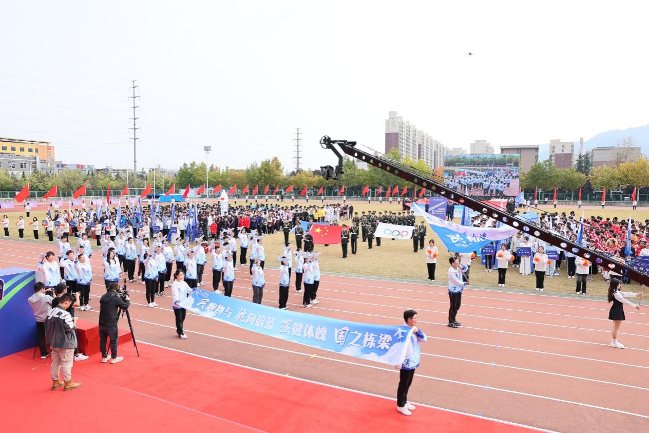 上午9点30分,开幕式在大家的期待中准时拉开帷幕。各代表团方阵依次进入比赛会场。走在最前面的是校国旗班方阵,他们护卫着国旗、校旗和奥林匹克会旗进入会场。紧随其后的是红旗方队、裁判员方队、冠军方队、各学院运动员方队以及教职工代表方队。大家排着整齐的队伍,迈着强劲有力的步伐,喊着响彻云霄的口号,朝气蓬勃、意气风发地依次从主席台前经过。铿锵的鼓点,撞击着年轻的心扉,激昂的旋律,充满着向上的力量!
