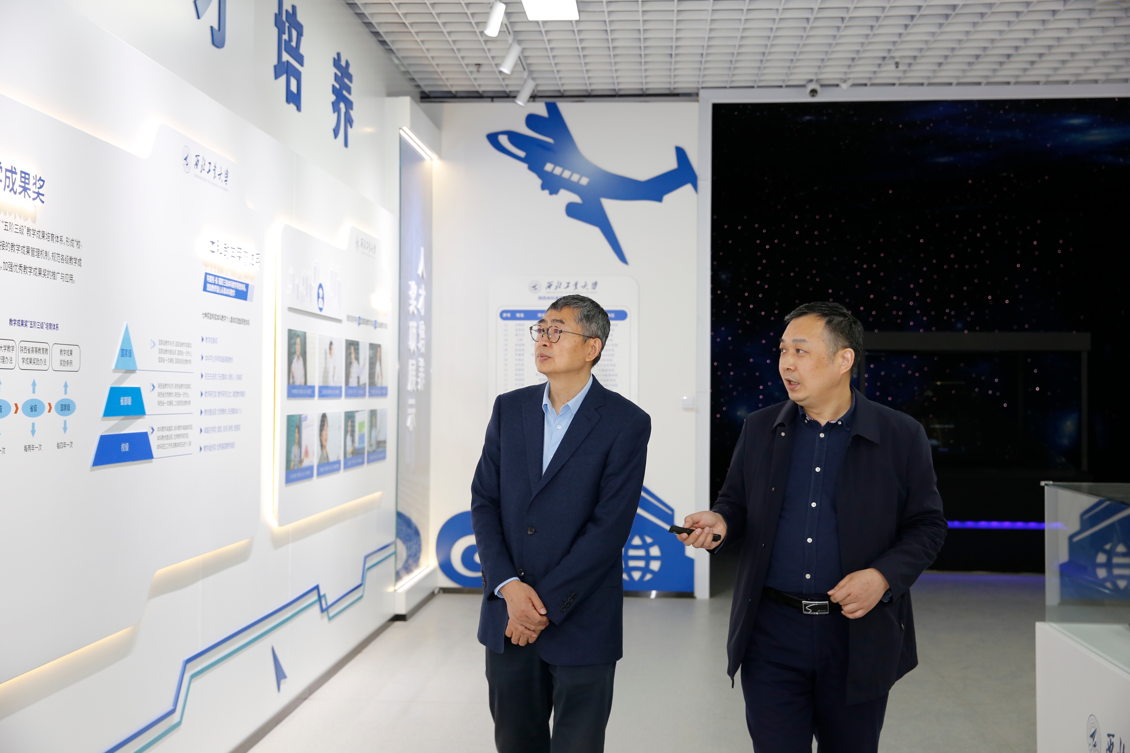 邓景辉在教务部部长王海鹏陪同下参观了“总师型”人才培养展馆,并与同学们在勇士雕塑前合影留念。