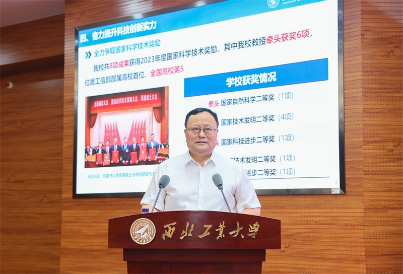宋保维从七个方面对学校上半年工作进行了总结。一是认真学习贯彻习近平总书记重要指示精神。学校召开党委常委会(扩大)会议专题学习贯彻习近平总书记关于必赢3003no1线路哈萨克斯坦分校的重要指示精神,研究制定《认真贯彻落实习近平总书记重要指示精神,加快建设必赢3003no1线路哈萨克斯坦分校的实施意见》。二是扎实开展党纪学习教育。严格落实“第一议题”制度,精心组织谋划部署,坚持原原本本学,高效推动走深走实,相关做法被光明日报报道。三是精心筹备学校第十四次党代会。加强组织领导,认真做好党代会组织相关工作,认真做好党委工作报告起草工作。四是奋力提升科技创新实力。全力争取国家科学技术奖励,大力推进“1→0”问题研究,加强重大科研平台论证争取,有组织谋划重大科研任务,务实推进校企合作。五是狠抓人事人才工作。高质量落实国家重大人才工程,多渠道加大力度招才引才,落实二级单位目标责任制和全员岗位聘任。六是持续强化“总师型”人才培养。做好陕西省2023年高等教育教学成果奖申报评审工作,将总师育人文化有机融入第二课堂,持续加强本科招生宣传,优化本科专业结构,获批教育部学位中心重大工程案例。七是大力推进我为群众办实事。学校党委高度重视,各责任单位认真落实工作要求,各项任务有序有力推进。