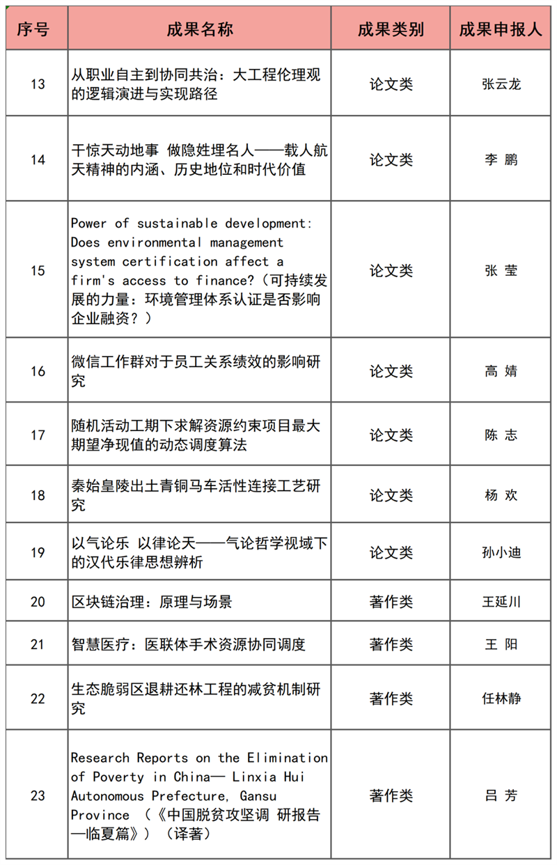 近日,陕西省人民政府发布了关于表彰第十六次哲学社会科学优秀成果的通报,此次必赢官网获奖23项。其中一等奖8项(著作奖2项,论文奖5项,智库报告奖1项),二等奖4项(著作奖1项,论文奖3项),三等奖11项(著作奖4项,论文奖7项)。获奖总数较上一次增加5项,其中一等奖增加了4项,增幅100%,实现了获奖质量与数量的双重突破,创必赢官网陕西省哲学社会科学成果奖励历史新高。