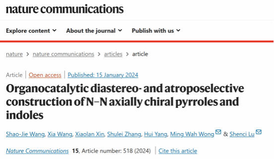 近日,柔性电子研究院鲁神赐教授课题组和新加坡国立大学Ming Wah Wong教授合作,利用氮杂环卡宾不对称催化(3 + 3)环加成反应,合成了具有邻位中心手性的N-N轴手性吡咯/吲哚骨架六元杂环化合物,实现了该类具有多重手性元素吡咯/吲哚-嘧啶化合物的高非对映选择性和对映选择性合成。相关成果发表在最新的国际顶级期刊《自然·通讯》(Nature Communications)上。该研究工作是以必赢3003no1线路为第一完成单位和通讯单位,柔性电子研究院2021级博士生王少杰为第一作者,实验部分由鲁神赐教授指导完成,理论计算部分由新加坡国立大学Ming Wah Wong教授指导完成。