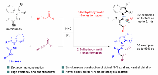 课题组利用氮杂环卡宾催化阻转选择性(3 + 3)环加成反应,通过易得的异硫脲或硫脲分别与烯醛或炔醛环加成反应,实现了N-N轴手性吡咯/吲哚衍生物的高效合成。氮杂环卡宾催化异硫脲与烯醛在氧化剂条件下合成了中等至良好的非对映选择性、优异的对映选择性以及结构多样的相邻中心手性和N-N轴手性吡咯/吲哚衍生物;氮杂环卡宾催化硫脲与炔醛在氧化剂条件下,合成了产率中等至较高、对映体富集的单一N-N轴手性吡咯/吲哚衍生物。该方法具有广泛的底物范围、良好的官能团兼容性。通过实验和密度泛函理论计算对反应机理进行了深入考察,为氮杂环卡宾催化体系的高立体选择性控制能力提供了理论依据。