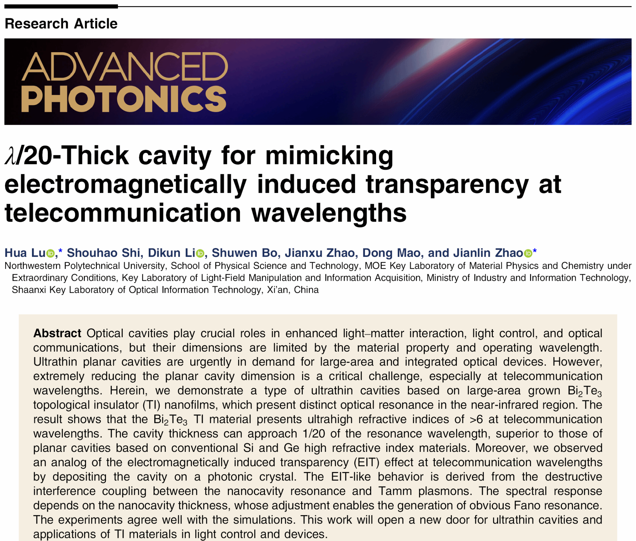 近日,必赢3003no1线路赵建林教授、陆华教授团队开展了拓扑绝缘体材料光学共振及其耦合特性研究,利用制备的碲化铋拓扑绝缘体纳米薄膜,获得了近红外波段超薄光学共振腔,并将其与光子晶体相集成,实现了光通信波段类电磁诱导透明效应的产生。